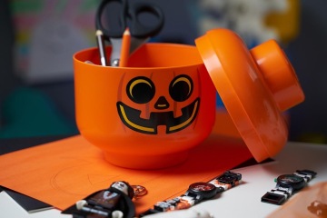 Tip pro vás: K masce dobře využijete i úložné LEGO hlavy. Vyrábí se v halloweenském designu lebky a dýně s obličejem. Děti je mohou nosit s sebou a představovat tak dýňového strašáka nebo kostlivce se sundavací hlavou. Do školy na halloweenský den je potom mohou vzít naplněné sladkostmi.