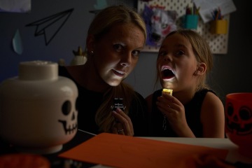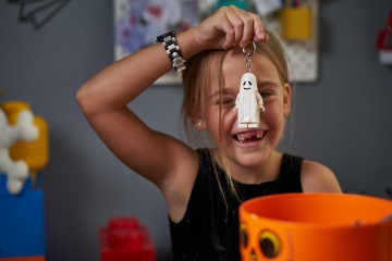 Tip pro vás: Klíčenky se světýlky využijete i pro hledání strašidelného pokladu. Umístěte dětem po domě indicie na papírcích a doveďte je třeba k LEGO hlavě plné gumových upířích zubů nebo myší.