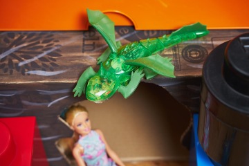 Jako drakův úkryt nám posloužila nevyužitá papírová krabice, do které jsme vystřihli díru jako vchod do opravdové jeskyně. Skalnaté okolí a kamení představovaly LEGO kostky. Ty měly zachráncům zkomplikovat přístup do jeskyně, a tím i k princezně.