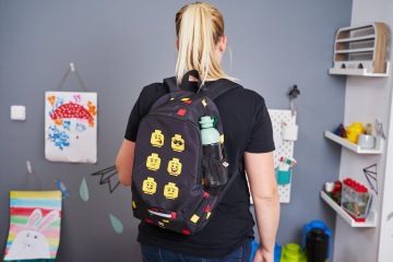 Black Faces školní batoh s hlavičkami a kostkami LEGO je nutný doplněk pro rodiče malých LEGO nadšenců.
