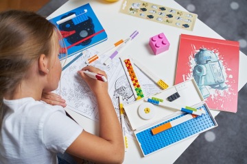 Fixy, gelovky, pravítko, pouzdro, nálepky, bloky...s tímto LEGEM můžou děti i do školy.