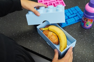 Během toho, co si Vali čistí zuby a obléká se, já připravuji svačinu. Máme od LEGA asi tři typy svačinových boxů, ale nejvíc mi vyhovuje krabička ve tvaru velké LEGO kostky. Má totiž ideální velikost.