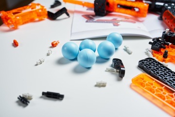 Krabice obsahuje 140 dílků, ze kterých postavíte supermoderní pistoli na kuličky. Tedy spíš na maličké balonky, které jsou také součástí balení.