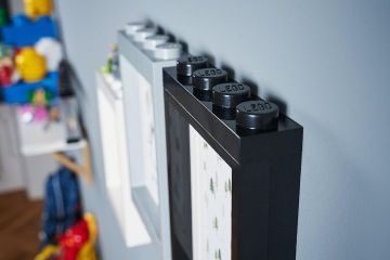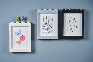 Stěnu jsme doplnili ještě o rámečky na fotky a vznikla nám tak kompletní designová LEGO zeď. Rámečky drží i samostatně postavené a dovnitř se vejdou fotky 10×15 nebo 12×17, s jejichž vložením pomůže kartonová pasparta. Skládat na sebe je zase můžete, jak se vám zlíbí. Tuto funkci u LEGO doplňků miluju.