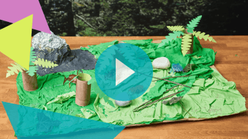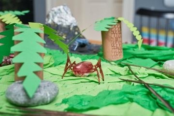 - Pevný karton, který poslouží jako podklad, pomalujte zelenými barvami a polepte ho mechem nebo kombinací hnědého a zeleného krepáku jako my. Nemusíte ho lepit po celém podkladu, třeba v rohu nechte místo na skálu.