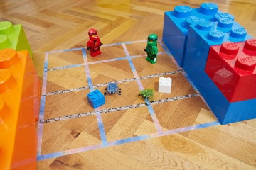 Závodní dráhu jsme vyznačili lepicí páskou a přidali několik pohyblivých překážek.